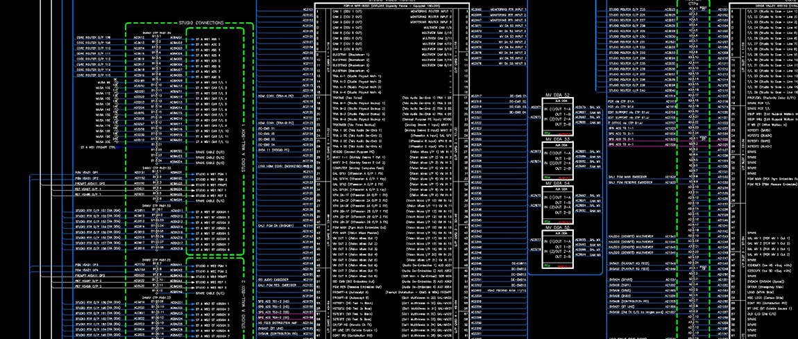 Schematic diagrams provided for all technical inter-area cables, including network, power and specialised cabling (such as SMPTE Triax camera cables).